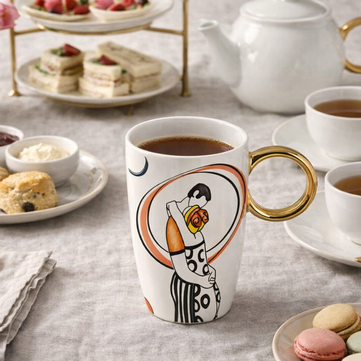 Made of porcelain and distinguished by an elegant design with a gold handle, Abbracci mugs combine functionality and style, becoming true decorative objects as well as everyday essentials. With a 420 ml capacity, they are perfect for long coffees, tea, herbal infusions, and relaxing moments to enjoy alone or share with others.