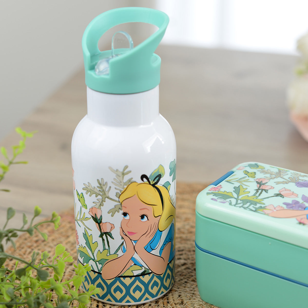 La "Bottiglia Termica Alice Tales ML 350" di EGAN è un oggetto pratico e affascinante che unisce funzionalità e design. Presenta un'immagine stilizzata di Alice, il celebre personaggio di "Alice nel Paese delle Meraviglie", inserita in un contesto floreale e sognante, perfettamente in linea con l'estetica del racconto.