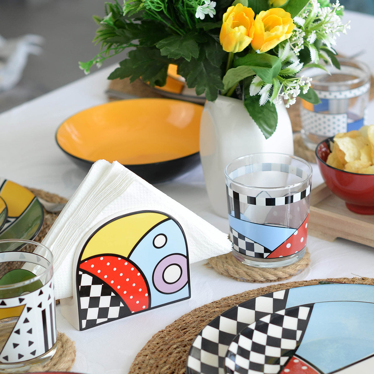 Il Portatovaglioli Warà 12x11 cm dona un tocco di colore e modernità alla tua tavola. Il suo design geometrico e vivace lo rende un elemento funzionale e decorativo, perfetto per arricchire la tua cucina con uno stile contemporaneo.